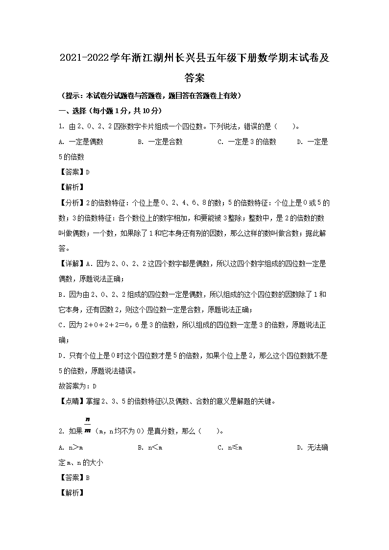 2021-2022学年浙江湖州长兴县五年级下册数学期末试卷及答案(Word版)09-26