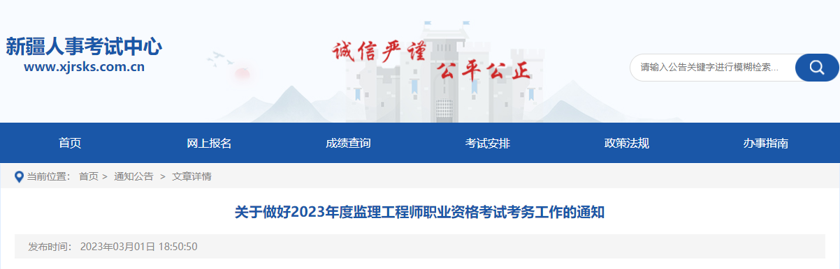 【#监理师考试# 导语】©文档大全网从新疆人事考试中心获悉,2023年新疆监理工程师报考工作现已启动,报名时间:3月13日-20日,考试时间:5月13日-14日,更多事宜请参考阅读《考务通知》,官方公告原文如下: