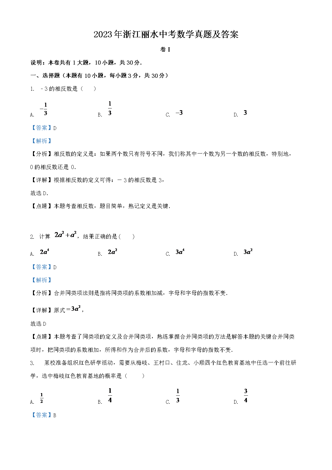 【文档预览】 文档大全网整理发布2023年浙江丽水中考数学真题及答案(Word版),前五页预览如下: