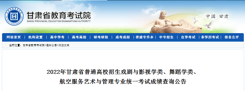 【#艺术高考# 导语】©文档大全网从甘肃省教育考试院了解到,2022年甘肃省普通高校招生戏剧与影视学类、舞蹈学类、 航空服务艺术与管理专业统一考试成绩查询公告。具体如下: