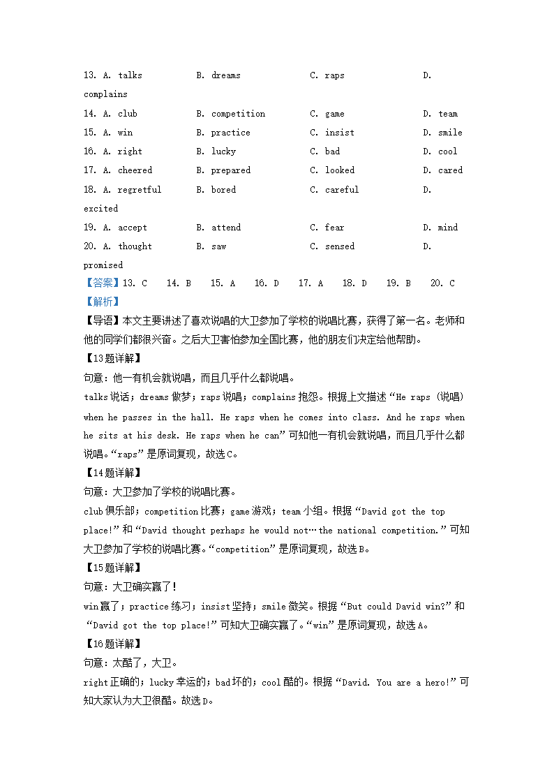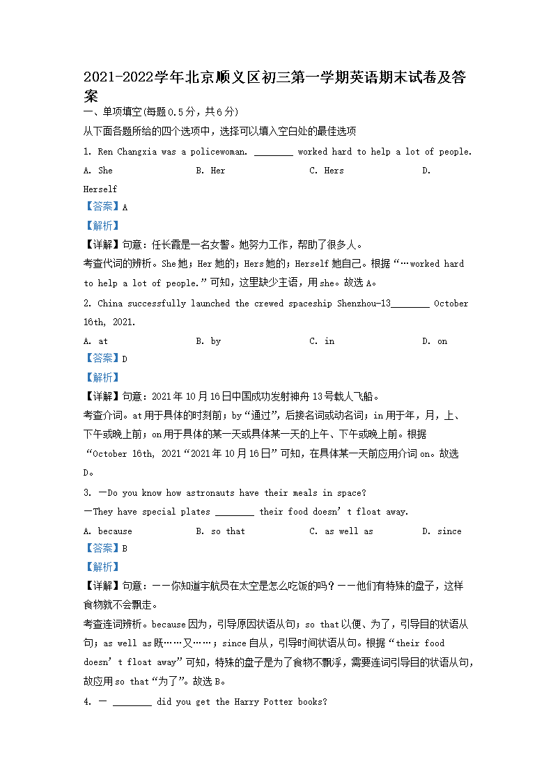 2021-2022学年北京顺义区初三第一学期英语期末试卷及答案(Word版)08-15