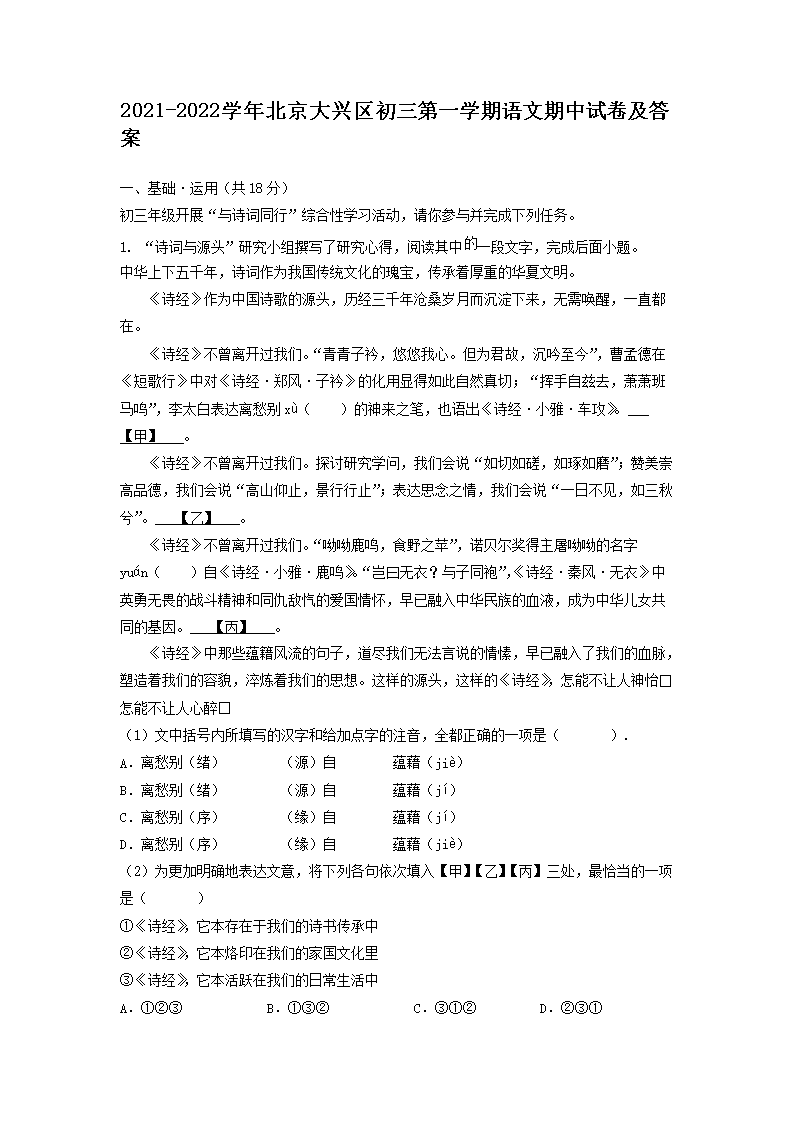 【文档预览】 文档大全网整理发布2021-2022学年北京大兴区初三第一学期语文期中试卷及答案(Word版),前五页预览如下: