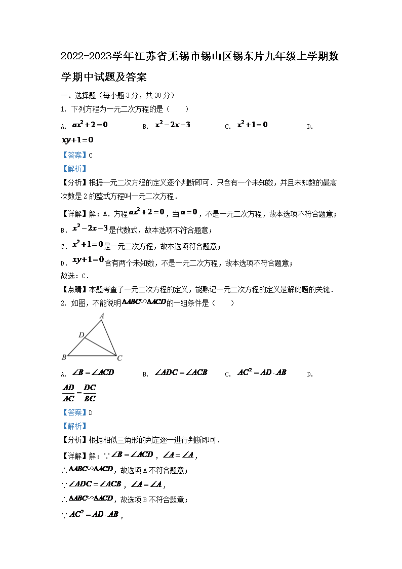 2022-2023学年江苏省无锡市锡山区锡东片九年级上学期数学期中试题及答案(Word版)09-26