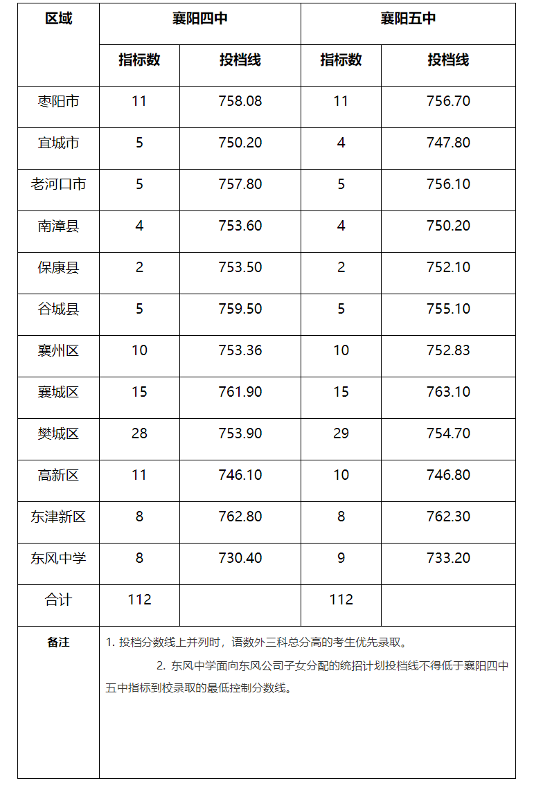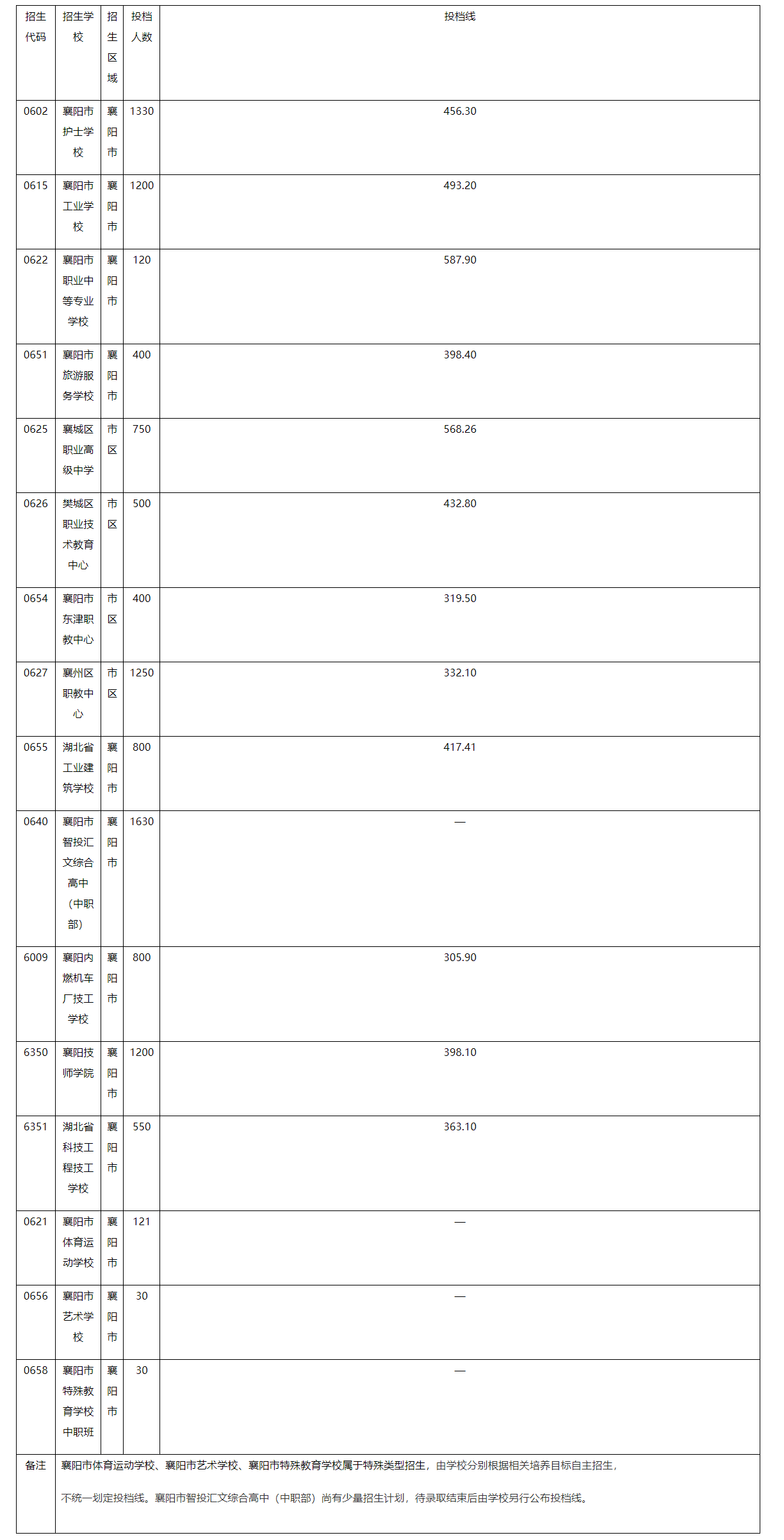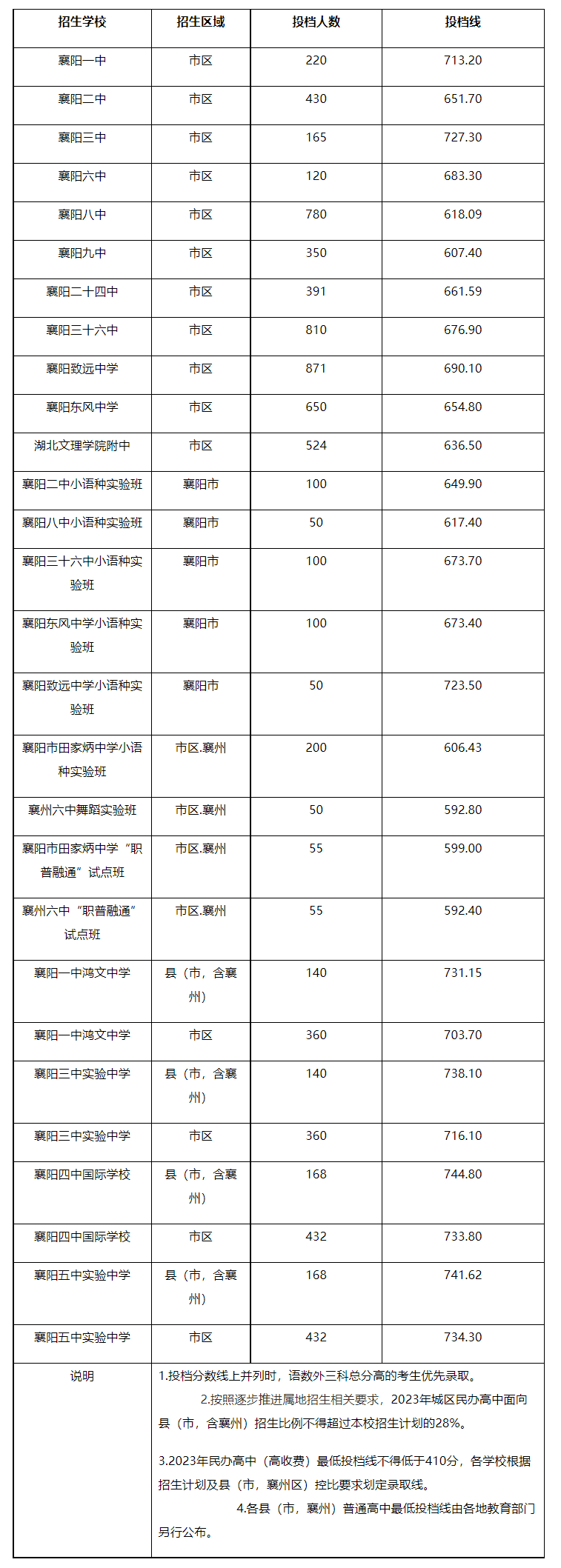 根据《襄阳市2023年高中阶段学校招生录取实施方案》(襄教发〔2023〕26号)精神,结合2023年全市高中阶段学校招生计划和考生志愿填报情况,“湖北省高中阶段学校招生管理信息系统”已按规定程序和平行志愿录取规则完成了投档录取工作。现将襄阳市区各高中阶段学校填报志愿投档分数线予以公布: