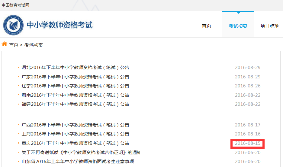 2017下半年教师资格证报名公告暂未发布,考生可参考2016下半年教师资格证报名公告发布时间,如下图所示,2016下半年教师资格证报名公告发布时间为8月15日起。根据历年公告发布时间,预计2017下半年教师资格证笔试公告将于8月中旬发布。