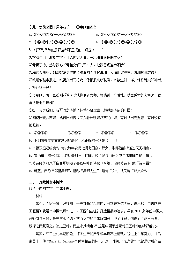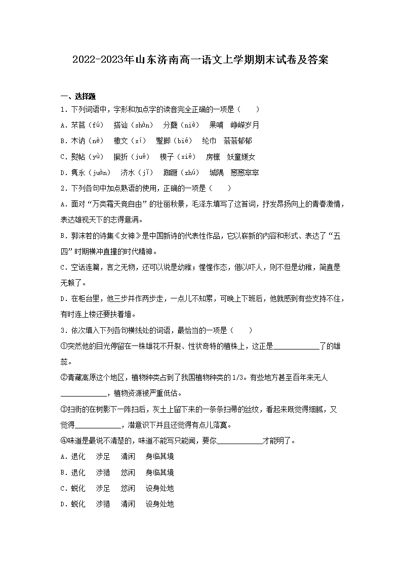 2022-2023年山东济南高一语文上学期期末试卷及答案(Word版)09-01