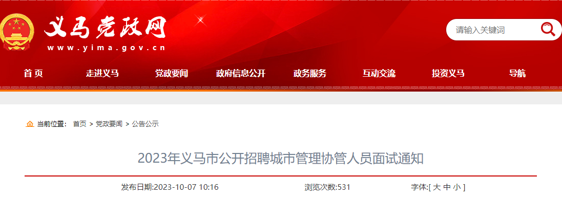 按照《2023年义马市公开招聘城市管理协管人员招聘公告》统一部署,定于2023年10月10日开展面试,具体通知如下: