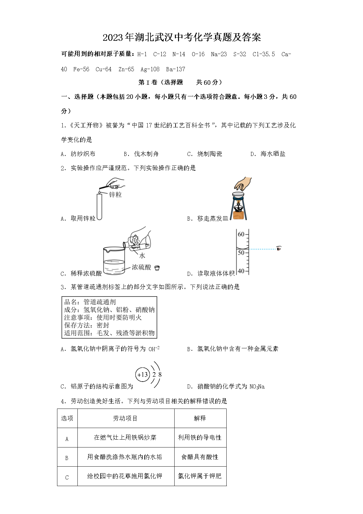 2023年湖北武汉中考化学真题及答案(Word版)07-15