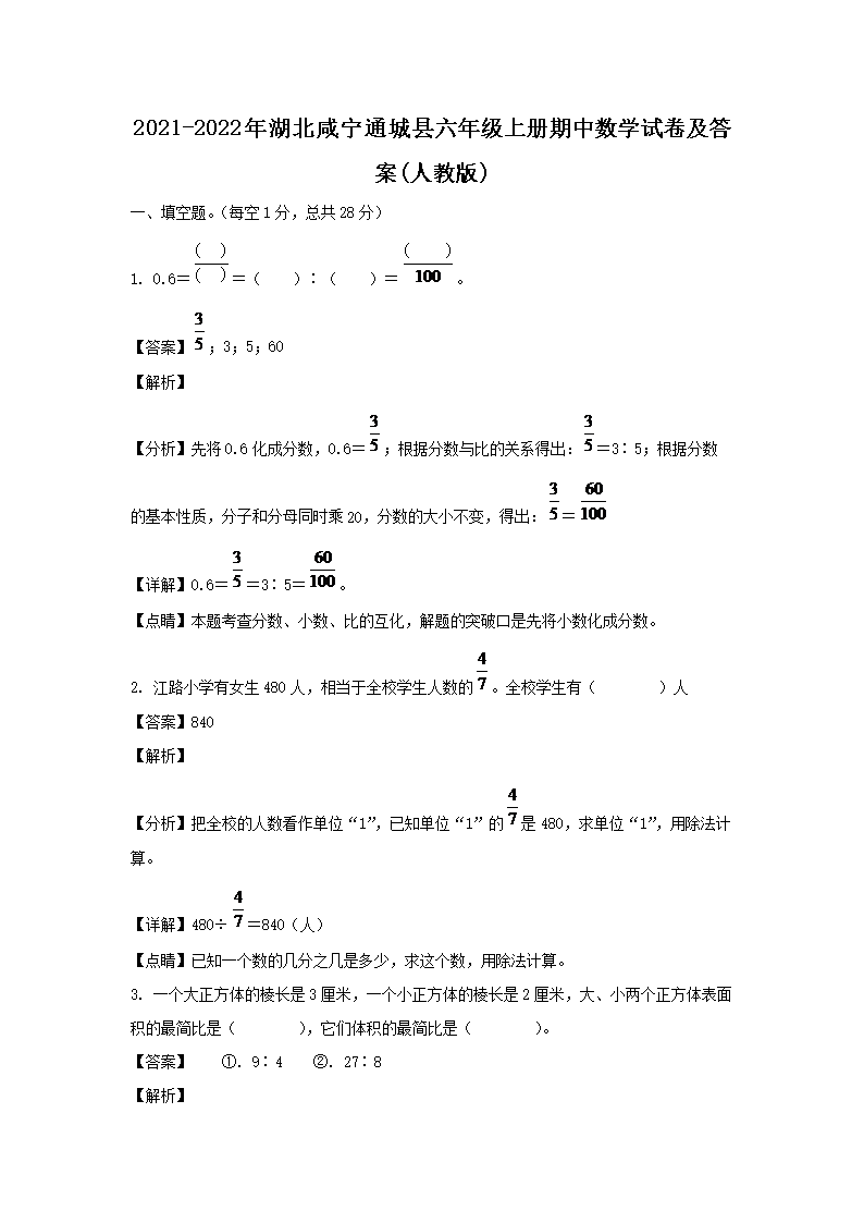 【文档预览】 文档大全网整理发布2021-2022年湖北咸宁通城县六年级上册期中数学试卷及答案(人教版)(Word版),前五页预览如下: