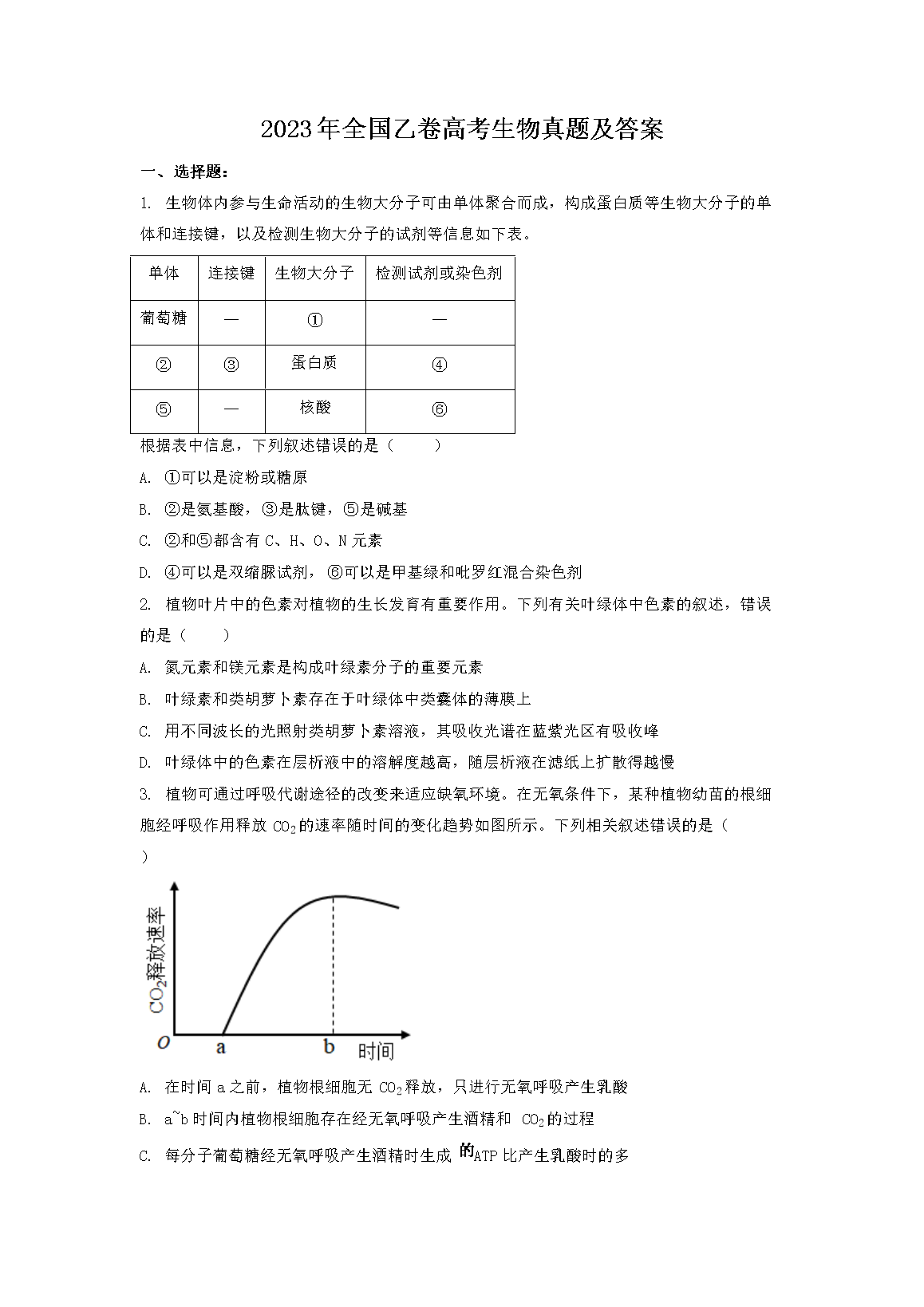 2023年全国乙卷高考生物真题及答案(Word版)06-10