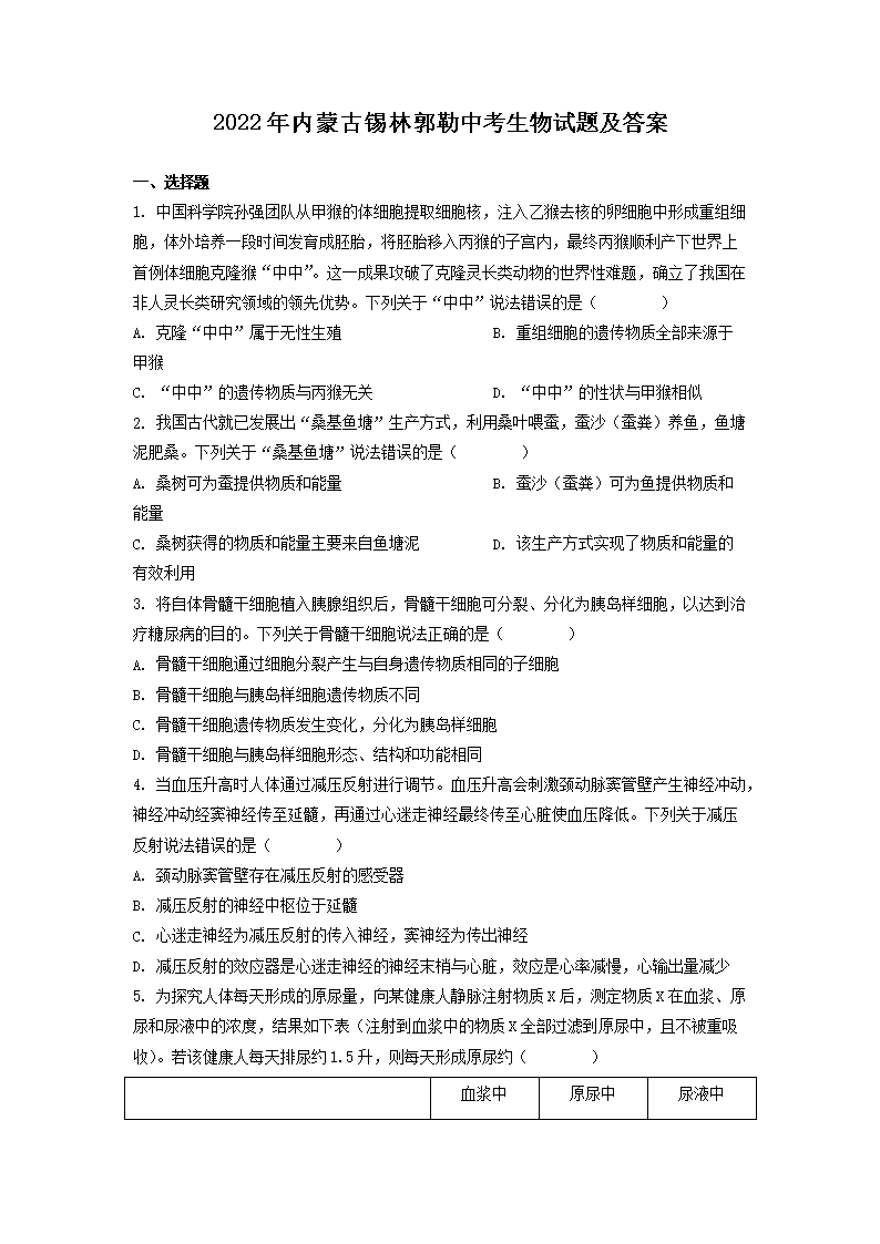 【文档预览】 文档大全网整理发布2022年内蒙古锡林郭勒中考生物试题及答案(Word版),前五页预览如下: