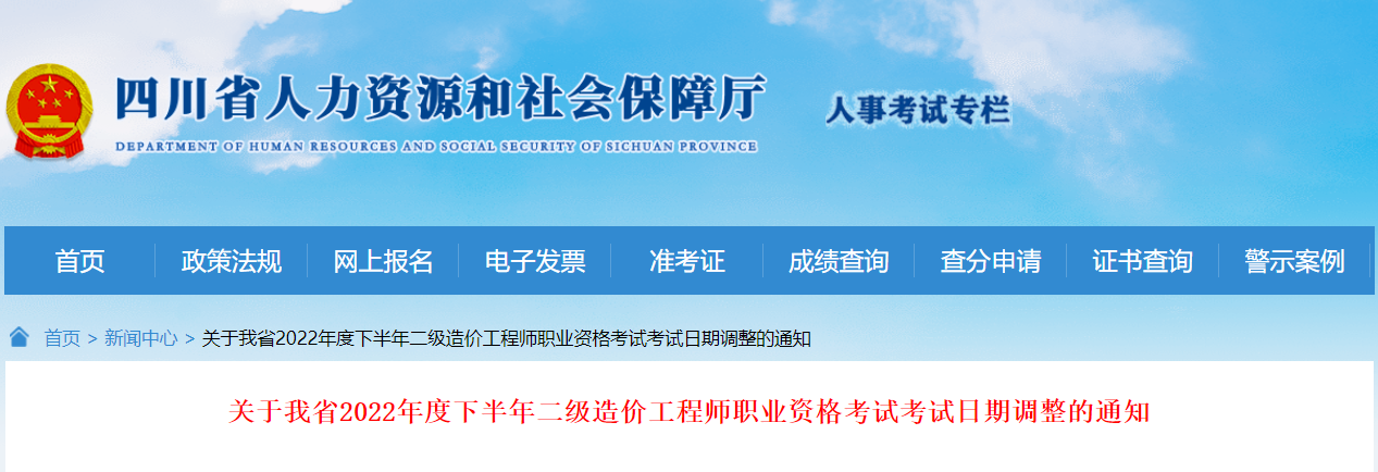 经研究,原定于2022年12月17日至18日进行的我省2022年度下半年二级造价工程师职业资格考试延期至2023年1月7日举行。请考生及时关注四川人事考试基地网(http://www.jdpta.com)和四川省人力资源和社会保障厅(http://rst.sc.gov.cn)“人事考试”专栏,了解相关信息。
