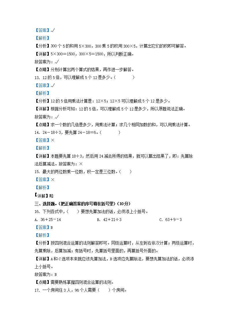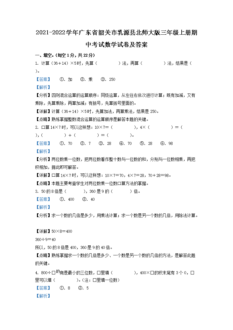 2021-2022学年广东省韶关市乳源县北师大版三年级上册期中考试数学试卷及答案(Word版)08-22