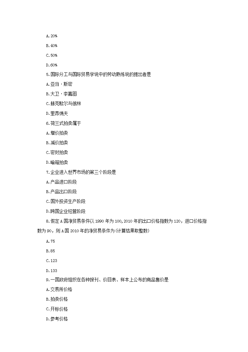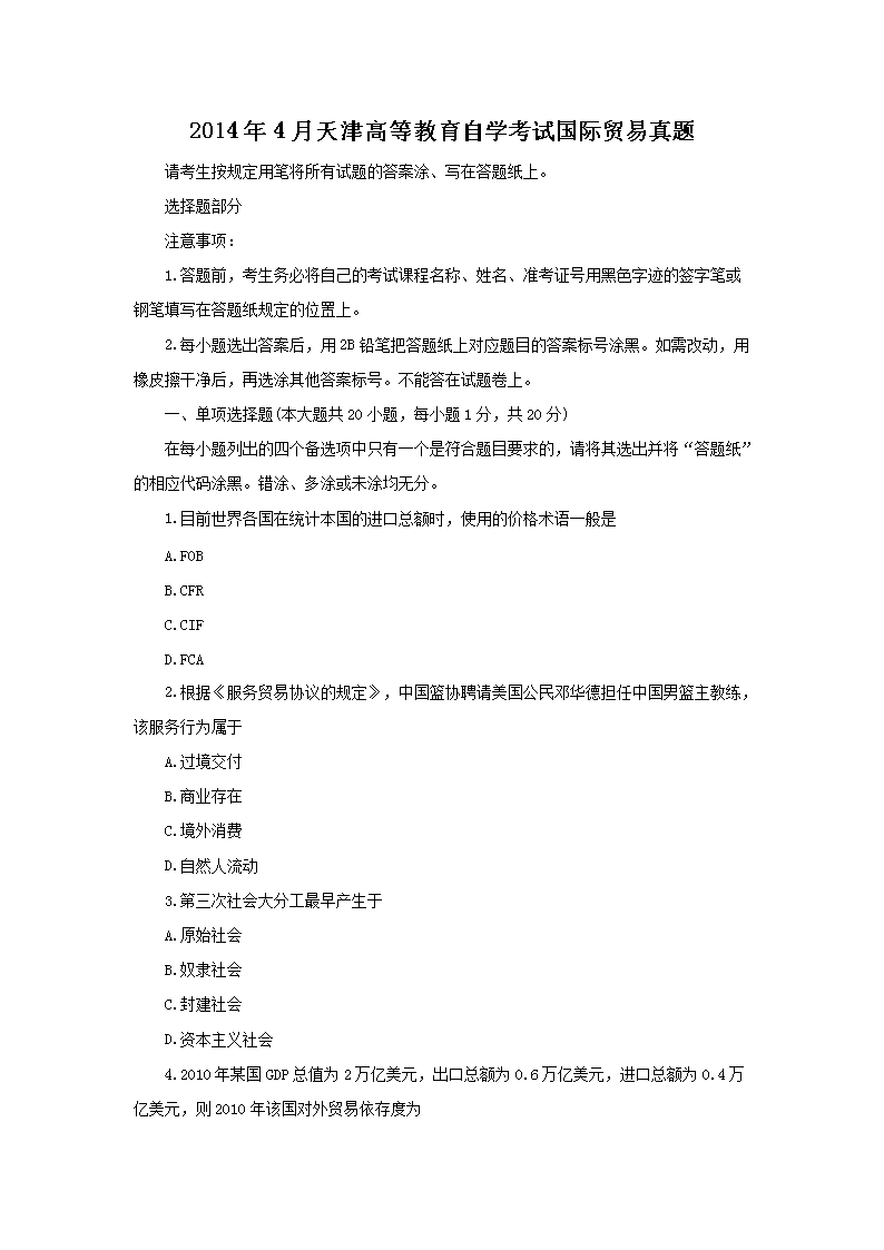 2014年4月天津高等教育自学考试国际贸易真题(Word版)06-01