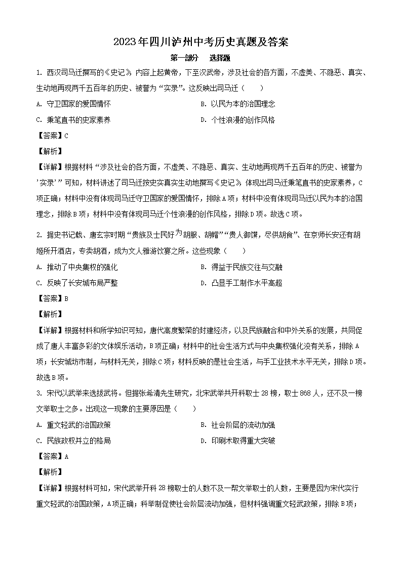 2023年四川泸州中考历史真题及答案(Word版)06-22