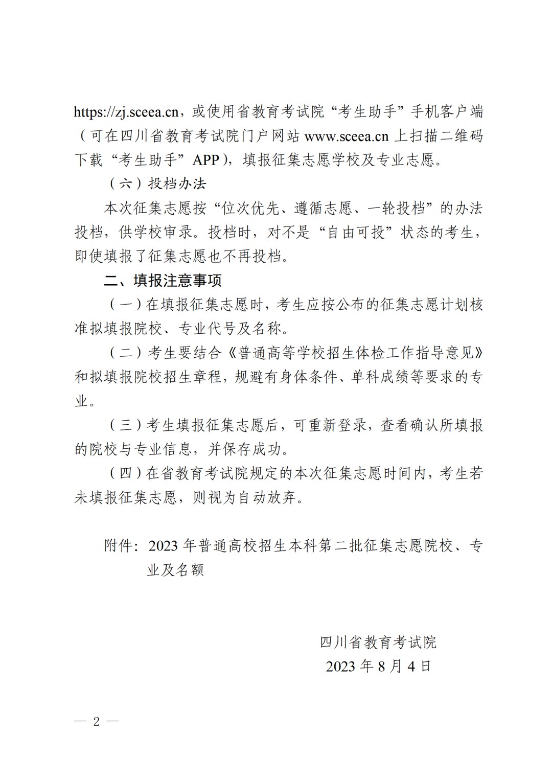 【#高考# 导语】©文档大全网高考频道从四川省教育考试院了解到,2023年四川高考本科第二批院校征集志愿的通知已公布,具体如下: