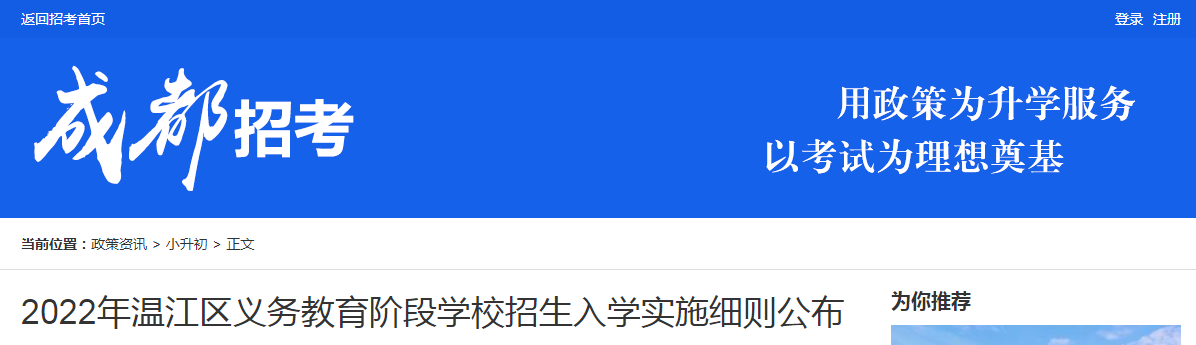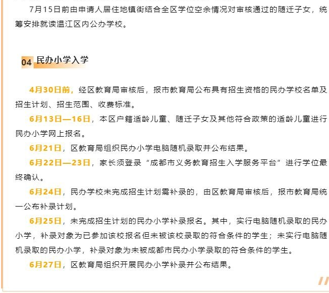 【#小升初# 导语】®文档大全网小升初频道从成都市教育考试院了解到,2022年四川成都温江区义务教育阶段学校招生入学实施细则公布已公布,详情如下:
