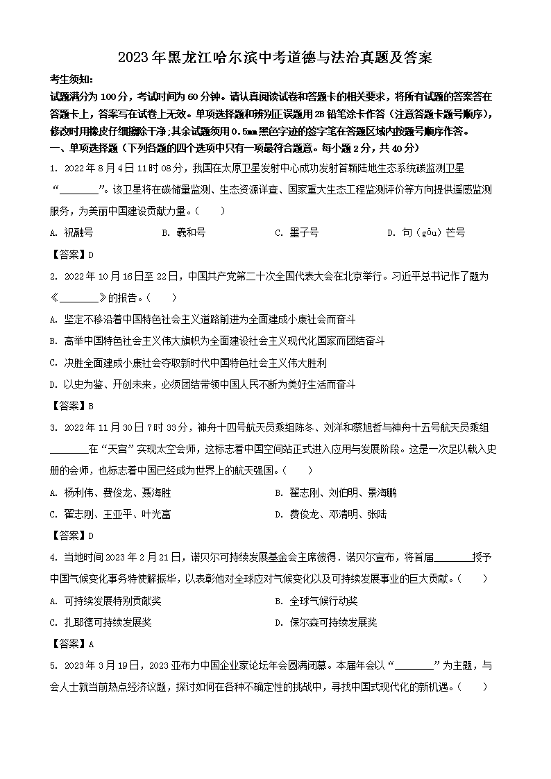 【文档预览】 文档大全网整理发布2023年黑龙江哈尔滨中考道德与法治真题及答案(Word版),前五页预览如下: