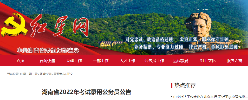 红星网首页设置“湖南省2022年考试录用公务员专题”,发布考试录用重要公告、相关政策和信息。