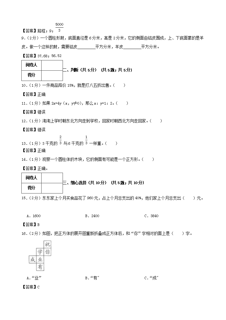 2021年陕西延安富县小升初数学真题及答案(Word版)06-15