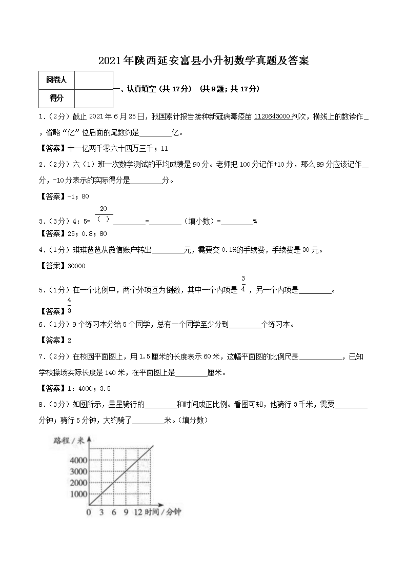 【文档预览】 文档大全网整理发布2021年陕西延安富县小升初数学真题及答案(Word版),前五页预览如下: