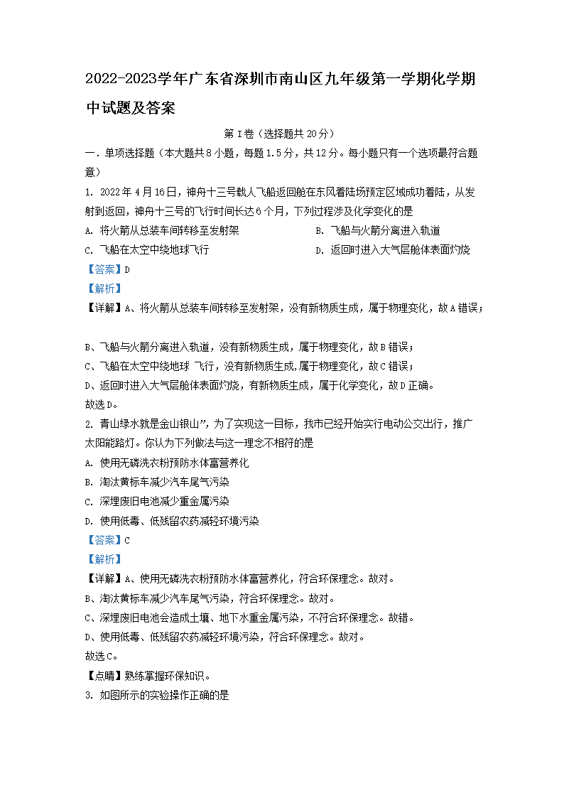 2022-2023学年广东省深圳市南山区九年级第一学期化学期中试题及答案(Word版)08-25